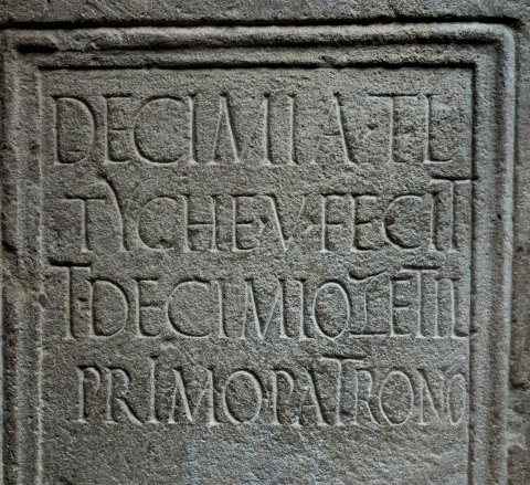 - Decimia T(iti) l(iberta) / Tyche v(iva) fecit / T(ito) Decimio Zeti l(iberto) / Primo patron(o)