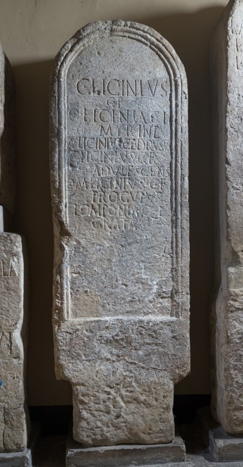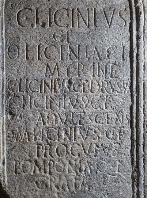 - C(aius) Licinius / C(ai) f(ilius) / |(obita) Licinia C(ai) l(iberta) / Myrine / C(aius) Licinius C(ai) e(ilius)! Drusus / C(aius) Licinius C(ai) f(ilius) / Adulescens / |(obitus) M(arcus) Licinius C(ai) f(ilius) / Proculus / Pomponia Q(uinti) l(iberta) / Grata