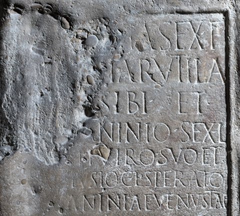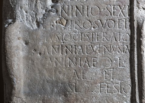 - [Canin]ia Sex(ti) f(ilia) / [Canin]ia Rutila / [3] sibi et / [Sex(to) C]aninio Sex(ti) l(iberto) / IIviro suo et / [C(aio) V]olusio C(ai) l(iberto) Sperato / [et C]aniniae Venustae / [et C]aniniae |(mulieris) l(ibertae) / [P]riscae et / [S(exto) Canini]o S(exti) l(iberto) Festo