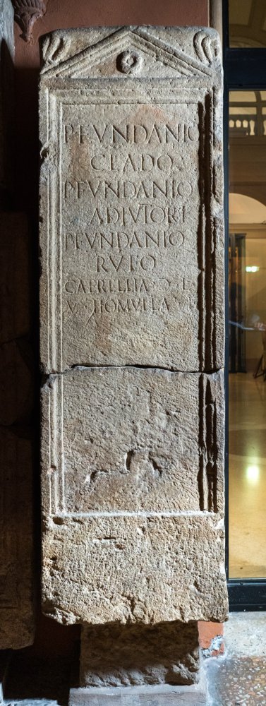 - P(ublio) Fundanio / Clado / P(ublio) Fundanio / Adiutori / P(ublio) Fundanio / Rufo / Caerellia |(mulieris) l(iberta) / Homulla / v(iva) f(ecit)