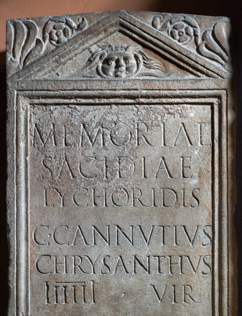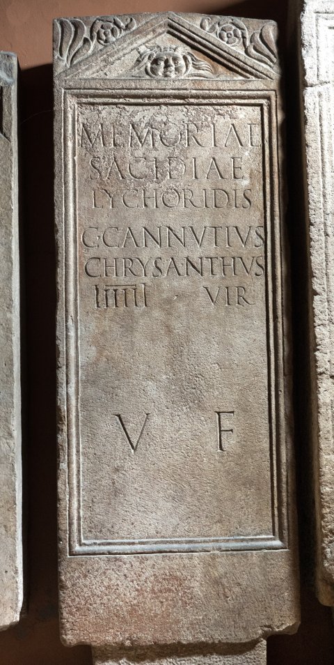 - Memoriae / Sacidiae / Lychoridis / C(aius) Cannutius / Chrysanthus / IIIIIIvir / v(ivus) f(ecit)