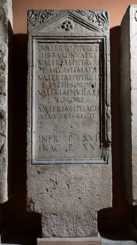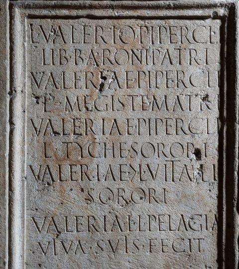 - L(ucio) Valerio Pipercli / lib(erto) / Baroni patri / Valeriae Pipercli / l(ibertae) Megiste matri / Valeriae Pipercli / l(ibertae) Tyche sorori / Valeriae |(mulieris) l(ibertae) Vitali / sorori / Valeria L(uci) l(iberta) Pelagia / viva suis fecit / in fr(onte) p(edes) XVI / in ag(ro) p(edes) XX