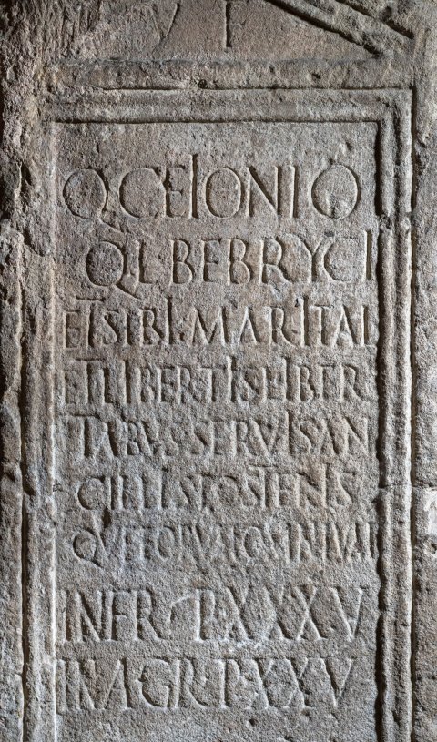 - V(ivus) f(ecit) // Q(uinto) Ceionio / Q(uinti) l(iberto) Bebryci / et sibi Marita l(iberta) / et libertis liber/tabus servis an/cillis posteris/que eorun(!) omnium / in fr(onte) p(edes) XXXV / in agr(o) p(edes) XXV
