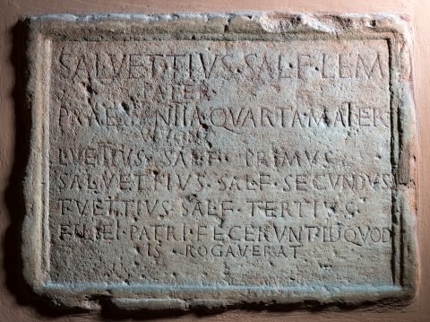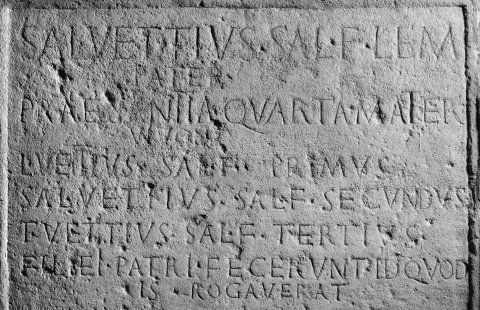 - Sal(vius) Vettius Sal(vi) f(ilius) Lem(onia) / pater / Praestantia Quarta mater / L(ucius) Vettius Sal(vi) f(ilius) Primus / Sal(vius) Vettius Sal(vi) f(ilius) Secundus / T(itus) Vettius Sal(vi) f(ilius) Tertius / fili{e}i patri fecerunt id quod / is rogaverat