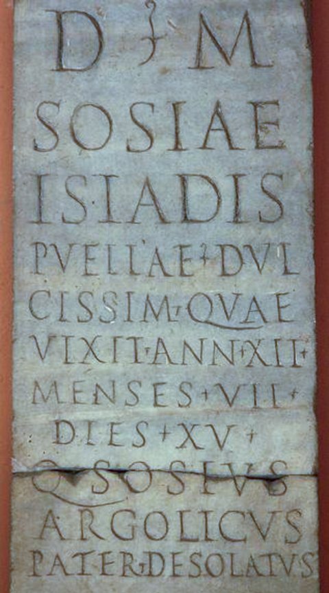 - D(is) M(anibus) / Sosiae / Isiadis / puellae dul/cissim(ae) quae / vixit ann(os) XII / menses VII / dies XV / Q(uintus) Sosius / Argolicus / pater desolatus