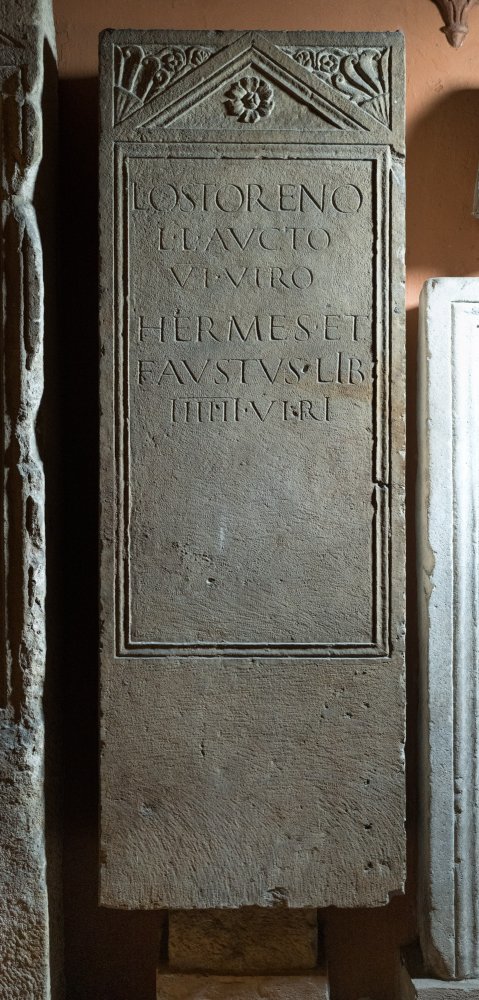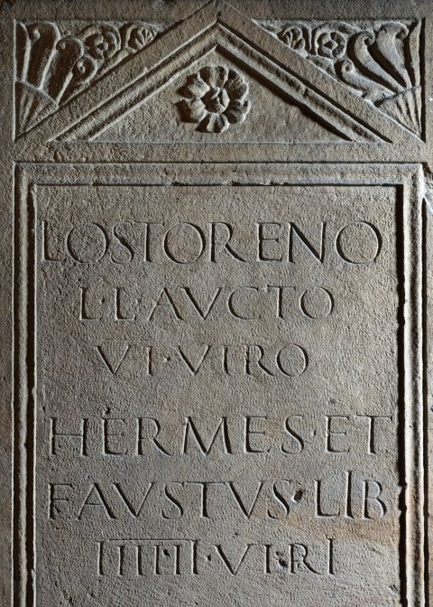 - L(ucio) Ostoreno / L(uci) l(iberto) Aucto / VIviro / Hermes et / Faustus lib(erti) / IIIIIIviri