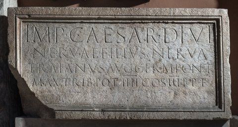 - Imp(erator) Caesar divi / Nervae f(ilius) Nerva / Traianus Aug(ustus) Germ(anicus) pont(ifex) / max(imus) trib(unicia) pot(estate) IIII co(n)s(ul) III p(ater) p(atriae) f(ecit)
