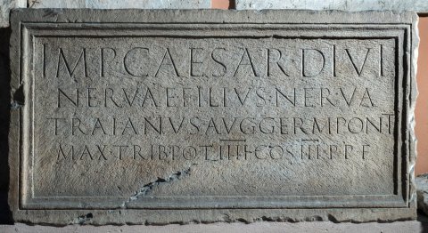 - Imp(erator) Caesar divi / Nervae f(ilius) Nerva / Traianus Aug(ustus) Germ(anicus) pont(ifex) / max(imus) trib(unicia) pot(estate) IIII co(n)s(ul) III p(ater) p(atriae) f(ecit)