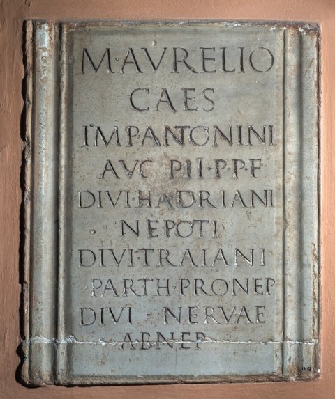 - M(arco) Aurelio / Caes(ari) / Imp(eratoris) Antonini / Aug(usti) [P]ii p(atris) p(atriae) f(ilio) / divi Hadriani / nepoti / divi Traiani / Parth(ici) pronep(oti) / divi Nervae / abnep(oti)