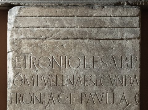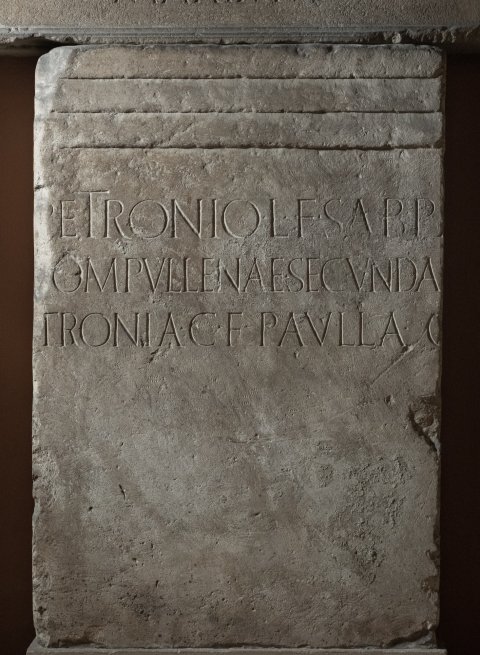 - [C(aio)] Petronio L(uci) f(ilio) Sab(atina) pa[tri(?)] / [P]ompullenae Secunda[e matri(?)] / [Pe]tronia C(ai) f(ilia) Paulla C[---]