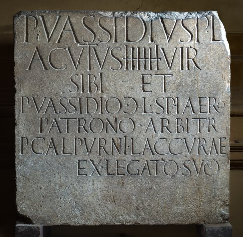 - P(ublius) Vassidius P(ubli) l(ibertus) / Acutus IIIIIIvir / sibi et / P(ublio) Vassidio |(mulieris) l(iberto) Sphaero / patrono arbitr(atu) / P(ubli) Calpurni Laccurae / ex legato suo