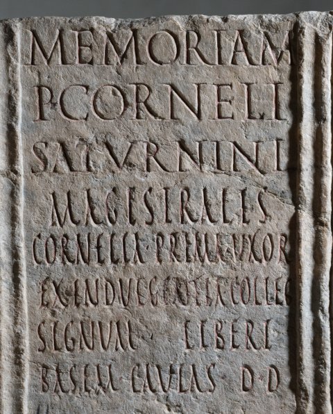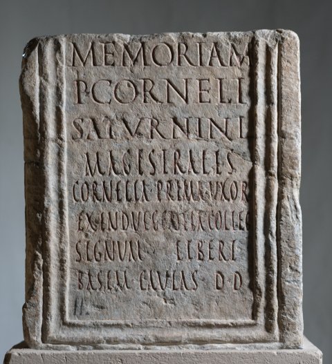 - --- in] / memoriam / P(ubli) Corneli / Saturnini / magistralis / Cornelia Prima uxor / ex indulgentia colleg(ii) / signum Liberi / basim caulas d(onum) d(edit)