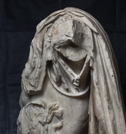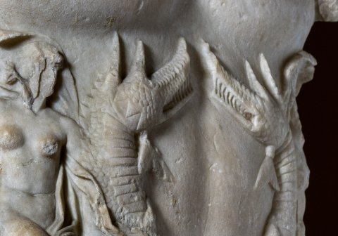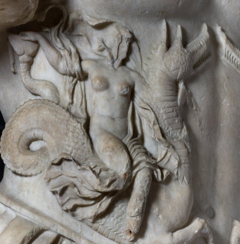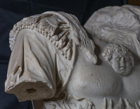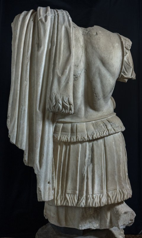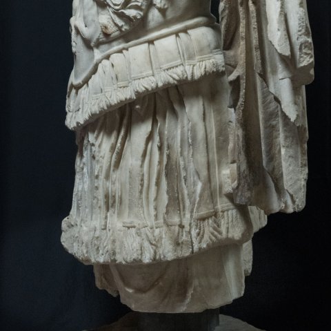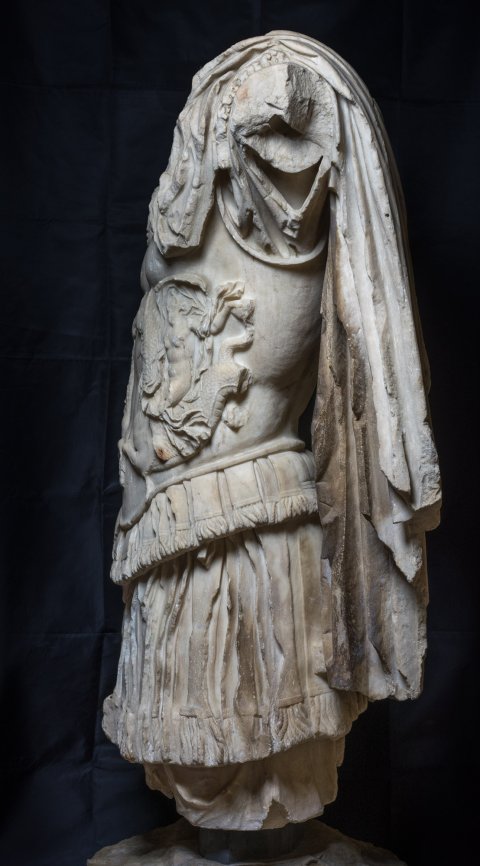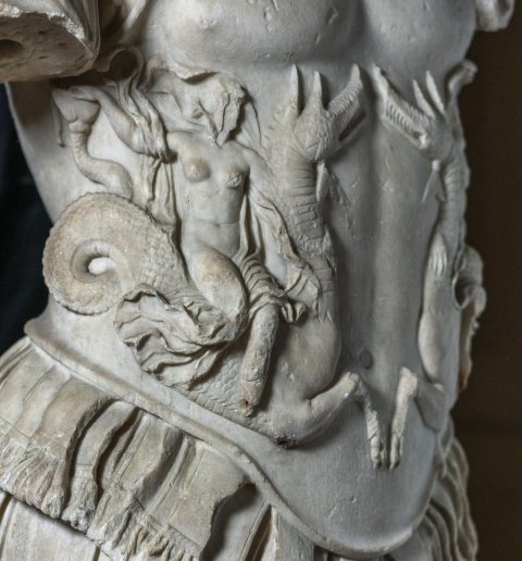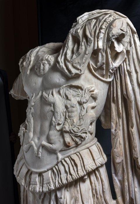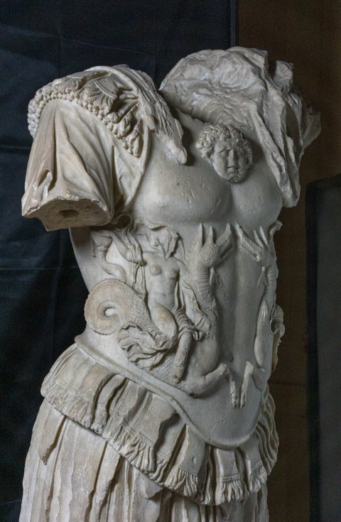 - Panzerstatue eines Kaisers (Nero ?), Mantel mit Fransensaum auf der linken Schulter. Auf dem Panzer Gorgoneion und Meerwesen (Nereiden auf Seedrachen).