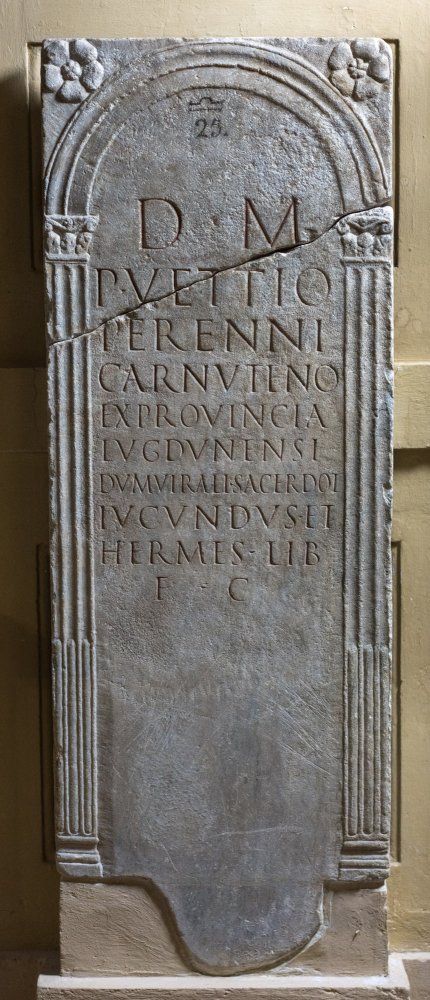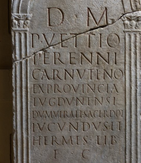- D(is) M(anibus) / P(ublio) Vettio / Perenni / Carnutino(!) / ex provincia / Lug(u)dunensi / du(u)mvirali sacerdot(i) / Iucundus et / Hermes lib(erti) / f(aciundum) c(uraverunt)