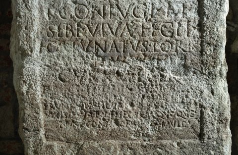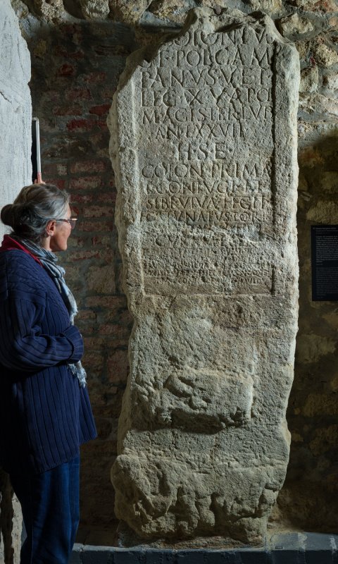 - [-] Cotonius / G(ai) f(ilius) Pol(lia) Cam/panus vet(eranus) / leg(ionis) XV Apol(linaris) / magister lud(orum) / an(norum) LXXVII / h(ic) s(itus) e(st) / Coton(ia) Prima / l(iberta) coniugi et / sibi viva fecit / Fortunatus Tor[-]/[---] Servatus IKI[---] / cur[a]ve[runt] / erunt q[u]ae meliora IAMSE[---]ROS(?) / vixi servat me securus quoque / nunc contegor hic tumulo