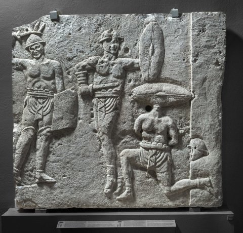 Links stehender Gladiator mit Beinschienen, Lendenschurz, Helm, in der Linken eckiger Schild, die Rechte erhoben mit gebogenem Schwert, In der Mitte in tänzerischer Haltung stehender Gladiator mit Stiefeln, Schurz, Unterarmschutz, Helm; in der Rechten Kurzschwert, in der erhobenen Linken ovaler Schild; unter dem Schild auf das Knie gesunkener Gladiator, Hände auf dem Rücken, in Stiefeln und Schurz, der Kopf verdeckt von quer liegendem Ovalschild; sein Helm wird rechts auf der Rahmenleiste sichtbar, die auch der linke Fuß des Knienden überschneidet.