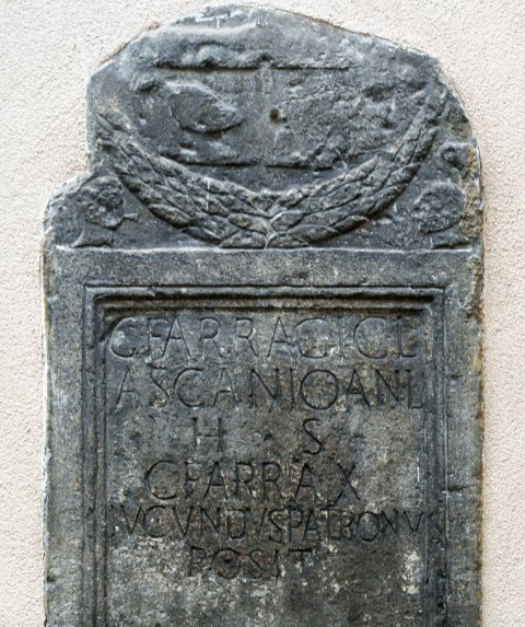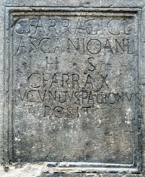- C(aio) Farraci C(ai) l(iberto) / Ascanio an(norum) L / h(ic) s(ito) C(aius) Farrax / Iucundus patronus / pos(u)it