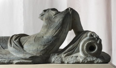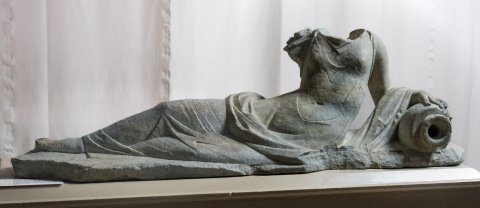 - mythische Figur: gelagerte Nymphe in Chiton und Mantel, linker Arm auf Gefäß gestützt