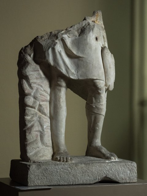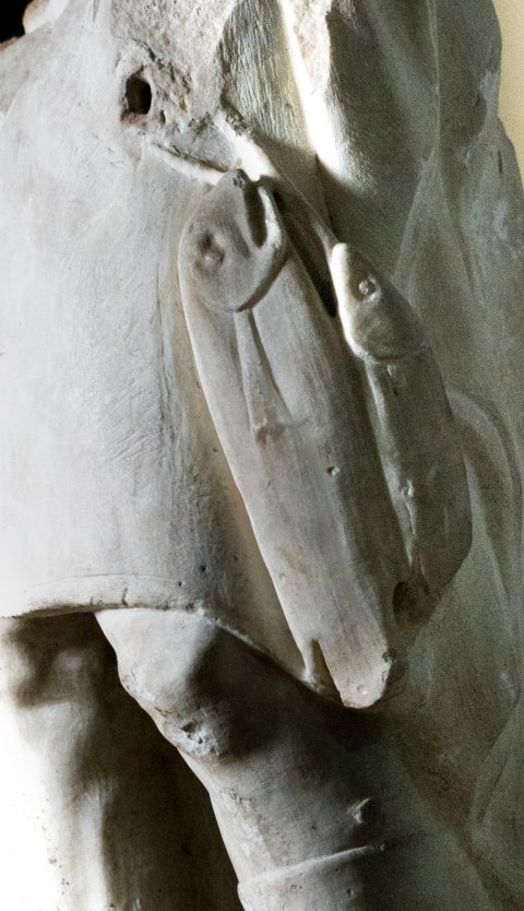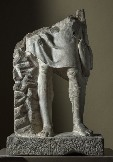 - Neben einem Felsen stehende Männerfigu in kurzer Tunica, im Rücken Mantel, um den linken Unterschenkel Bandage; an der linken Hüfte hängen zwei Fische.