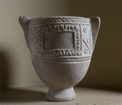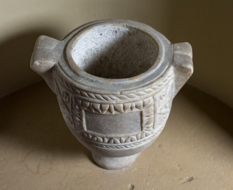 - Urne in Kelchform mit zwei Henkeln, tabula ansata mit Kymationrahmen und Rosetten in den ansae, am oberen Rand und unter der tabula tordiertes Band.