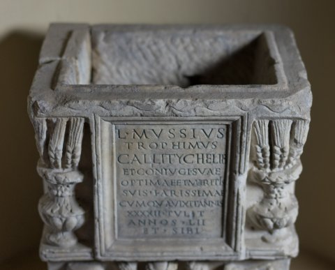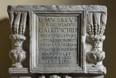 - L(ucius) Mussius / Trophimus / Callityche lib(ertae) / et coniugi suae / optimae et meritis / suis karissimae / cum qua vixit annis / XXXXII tulit / annos LII / et sibi