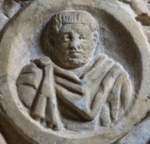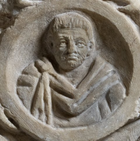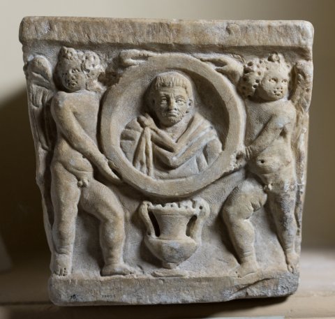 Auf Vorder- und beiden Nebenseiten je ein von Eroten gehaltenes Medaillon mit Büste eines bärtigen Mannes im Sagum mit Scheibenfibel. Unter dem Medaillon Krater. Die Eroten der Vorderseite tragen Fackeln, zu ihren Füßen liegen Panther.