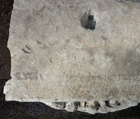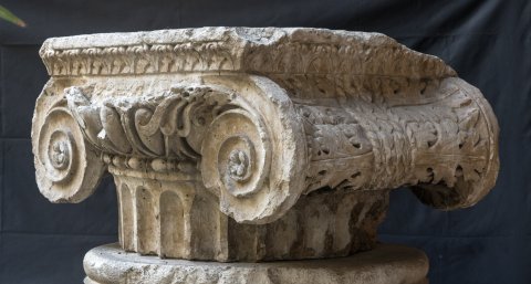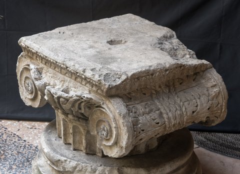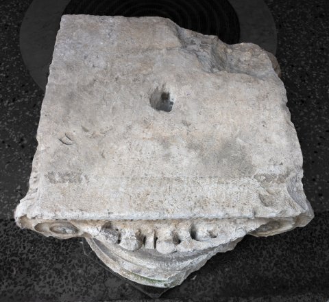 - Jonisches Kapitell mit Ansatz des kannelierten Säulenschaftes; mit Lorbeerband geschnürte pulvini mit Akanthusdekor, zwischen den Voluten Eierstab, darunter Perlstab; unterhalb der Abacusplatte Kymation.