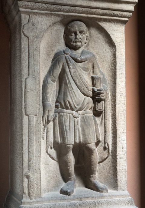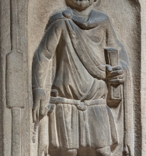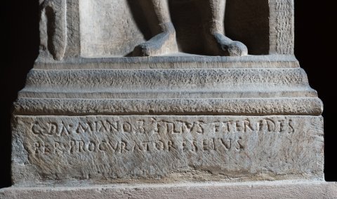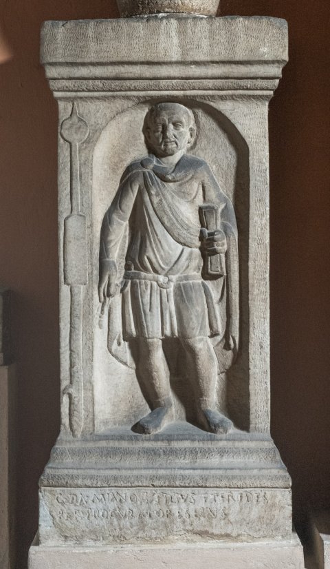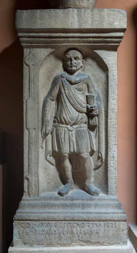 - Grabaltar mit darauf stehender zweihenkeliger Urne mit Deckel (zugehörig ?). Auf der Vorderseite in Bogennische stehender bärtiger Soldat mit Gürtel mit Ringschnalle und Sagum mit Scheibenfibel, in der Linken Schreibzeug (?). Auf der linken Rahmenleiste Beneficiarierlanze. Inschrift auf der Basis.