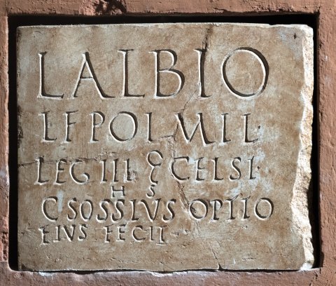 - L(ucio) Albio / L(uci) f(ilio) Pol(lia) mil(iti) leg(ionis) III |(centuria) Celsi / h(ic) s(itus) / C(aius) Sossius optio / eius fecit