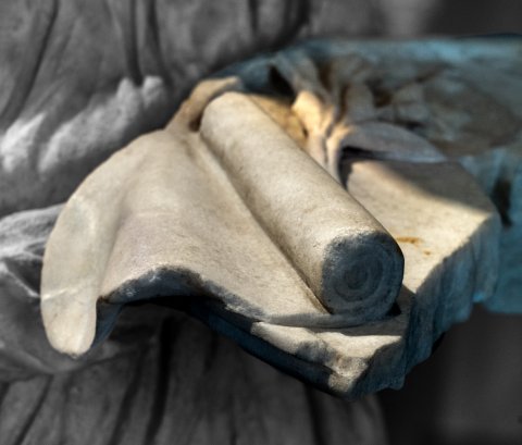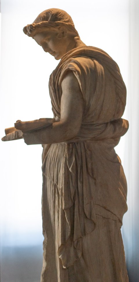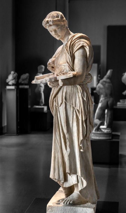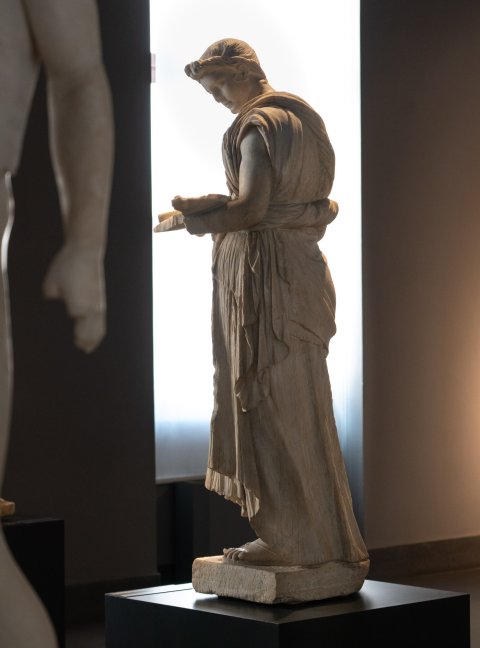 - Mythische Figur ? Statue einer Opferdienerin (Elektra ?) in hoch gegürtetem Chiton, um die Taille gewickeltem Mantel und Sandalen, in den Händen Tablett mit aufgerollter Binde, Zweig und Löwenfüßen eines Gefäßes. Römische Kopie einer hellenistischen Bronzestatue.