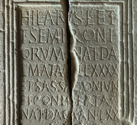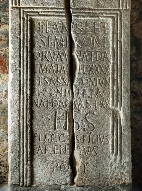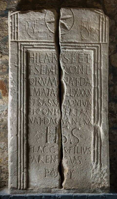 - Hilarus L(uci) et / T(iti) Semproni/orum nat(ione) Da/lmata [a]n(norum) LXXXX / et Sassa coniun(x) / et conliberta / nat(ione) Daca an(norum) LXX / h(ic) s(iti) s(unt) / Flacc[u]s filius / paren[ti]bus / po[s](u)it