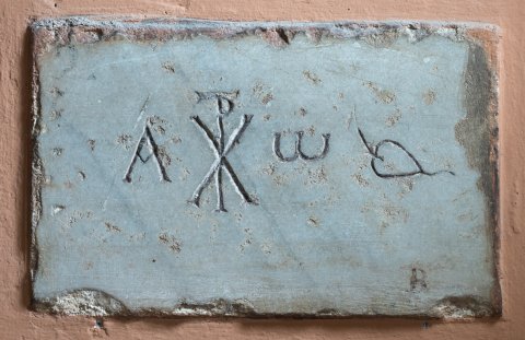 - Christogramm zwischen Alpha und Omega, rechts Efeublatt