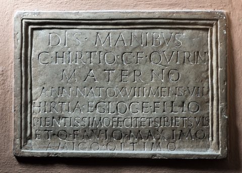 - Dis Manibus / C(ai) Hirtio C(ai) f(ilio) Quirin(a) / Materno / ann(os) nato XVIII mens(es) VII / Hirtia Egloge filio / pientissimo fecit et sibi et suis / et Q(uinto) Fa<b=V>io Maximo / amico optimo