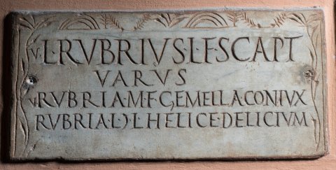 - V(ivus) L(ucius) Rubrius L(uci) f(ilius) Scapt(ia) / Varus / v(iva) Rubria M(arci) f(ilia) Gemella coniu(n)x / Rubria L(uci) |(mulieris) l(iberta) Helice delicium