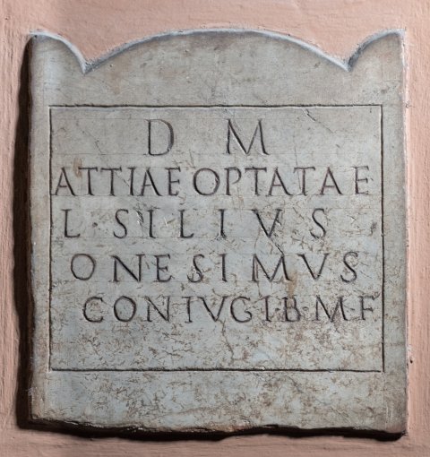 - D(is) M(anibus) / Attiae Optatae / L(ucius) Silius / Onesimus / coniugi b(ene) m(erenti) f(ecit)