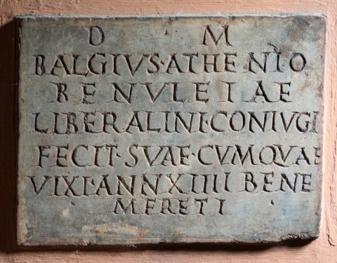- D(is) M(anibus) / Balgius Athenio / Benuleiae(!) / Liberalini coniugi / fecit suae cum qua{e} / vixi ann(os) XIIII bene / mere(n)ti