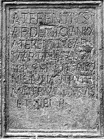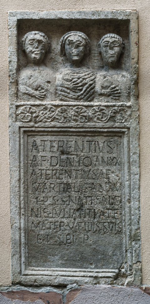 - A(ulus) Terentius / A(uli) f(ilius) Dento an(norum) XX / A(ulus) Terentius A(uli) f(ilius) / Martialiis an(norum) XXV / h(ic) s(iti) s(unt) nati Salo/nis Iulia Titia T(iti) f(ilia) / mater v(ivae) filiis suis / et sibi p(osuit)