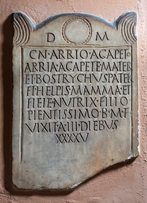 - D(is) M(anibus) // Cn(aeo) Arrio Agapeto / Arria Agapete mater / et Bostrychus pater / ft(!) Helpis mamma et / fiei(a)e(!) nutrix filio / pientissimo b(ene) m(erenti) f(ecit) / vixit a(nnis) III diebus / XXXXV