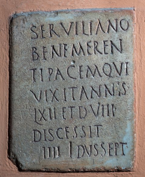 - Serviliano / bene meren/ti pacem(!) qui / vixit annis / LXII et d(iebus) VIII / et d(iebus) VIII / discessit / IIII Idus Sept(embres)