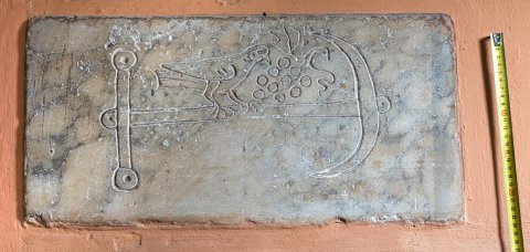 - liegender Anker, auf dem ein Vogel sitzt, vor ihm Weintraube (Ritzzeichnung)