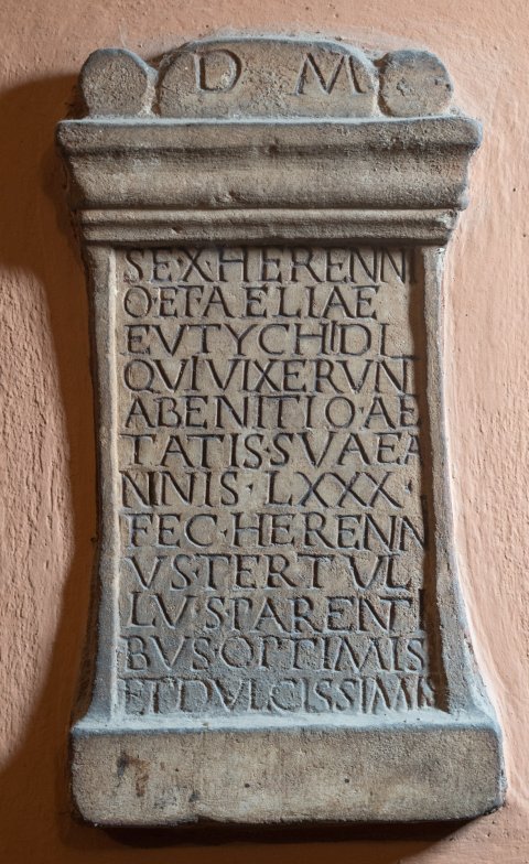 - D(is) M(anibus) // Sex(to) Herenni/o et Aeliae / Eutychidi / qui vixerunt / ab enitio(!) ae/tatis suae a/nnis LXXX / fec(it) Herenni/us Tertul/lus parenti/bus optimis / et dulcissimis