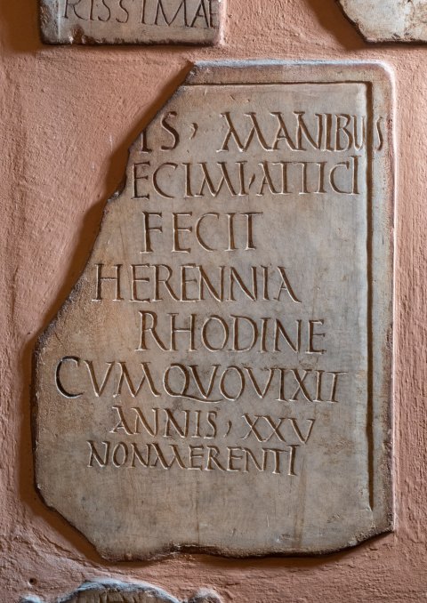 - [D]is Manibus / Decimi Attici / fecit / Herennia / Rhodine / cum quo vixit / annis XXV / non merenti