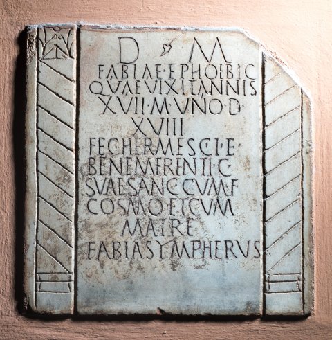 - D(is) M(anibus) / Fabiae Ephoebic(ae) / quae vixit annis / XVII m(ense) uno di(ebus) / XVIII / fec(it) Hermes C() I() E() / bene merenti c(oniugi) / suae sanc(tissimae) cum F(lavio) / Cosmo et cum / matre / Fabia Sympherusa