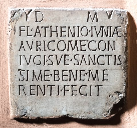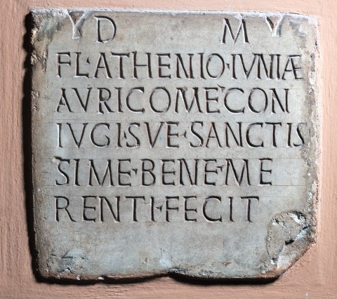 - D(is) M(anibus) / Fl(avio) Athenio Iuniae / Auricom(a)e con/iugi su(a)e sanctis/sim(a)e bene me/renti fecit