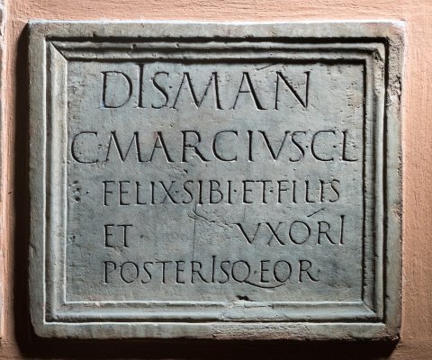 - Dis Man(ibus) / C(aius) Marcius C(ai) l(ibertus) / Felix sibi et fili(i)s / et uxori / posterisq(ue) eor(um)