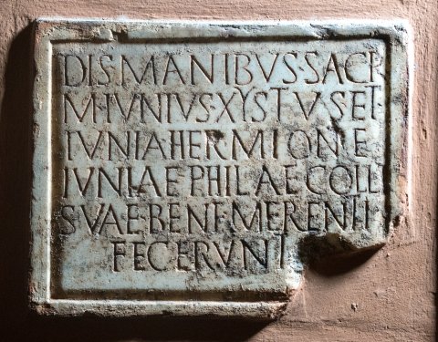 - Dis Manibus sacr(um) / M(arcus) Iunius Xystus et / Iunia Hermione / Iuniae Philae colli(bertae) / suae bene merenti / fecerunt