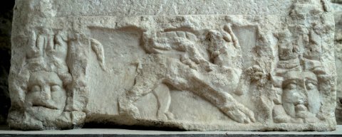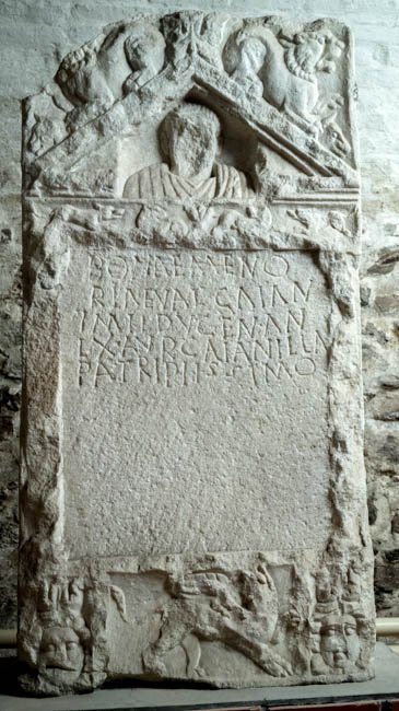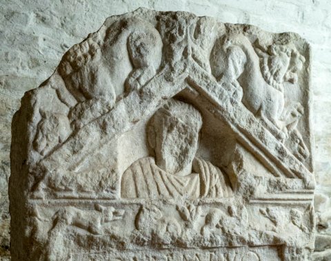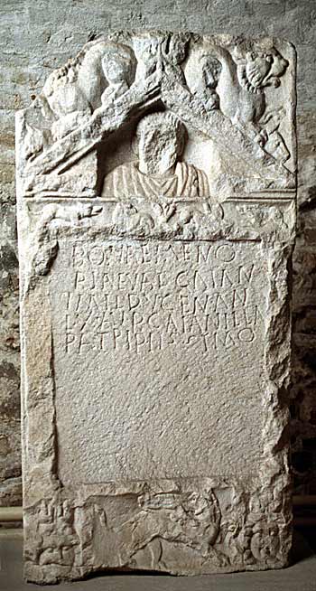 Im Giebel in sekundär eingetiefter eckiger Nische Büste eines Mannes: bartlos, kurzes Haar, Tunica, Mantel.