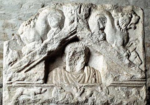 Hauptbild u. Inschr. sekundär auf älterer Stele