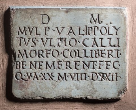 - D(is) M(anibus) / M(arcus) Ulp(ius) Val(erius?) Ippoly/tus Ulpio Calli/morfo collibert(o) / bene merent(i) fec(it) / q(ui) v(ixit) a(nnos) XX m(enses) VIII d(ies) XXII