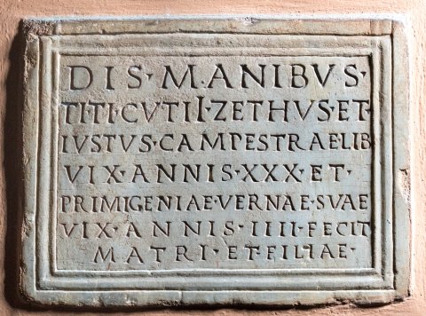 - Dis Manibus / Titi Cutii Zethus et / Iustus Campestrae lib(ertae) / vix(it) annis XXX et / Primigeniae vernae suae / vix(it) annis IIII fecit(!) / matri et filiae
